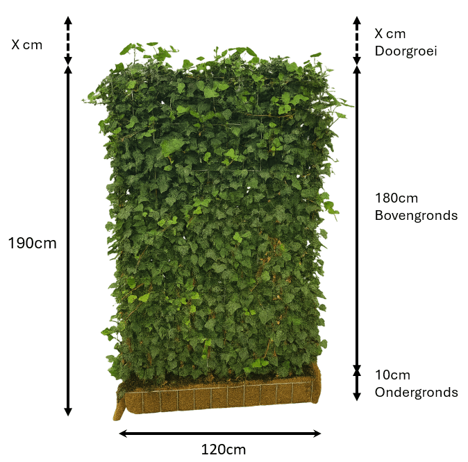 De Hedera haag is wintergroen, snelgroeiend en blijft het hele jaar door mooi vol. Dankzij de volwassen hoogte van 180 cm (ca. 190 cm inclusief wortelpakket) heb je direct minder inkijk en geniet je meteen van een natuurlijke, levende tuinafscheiding.