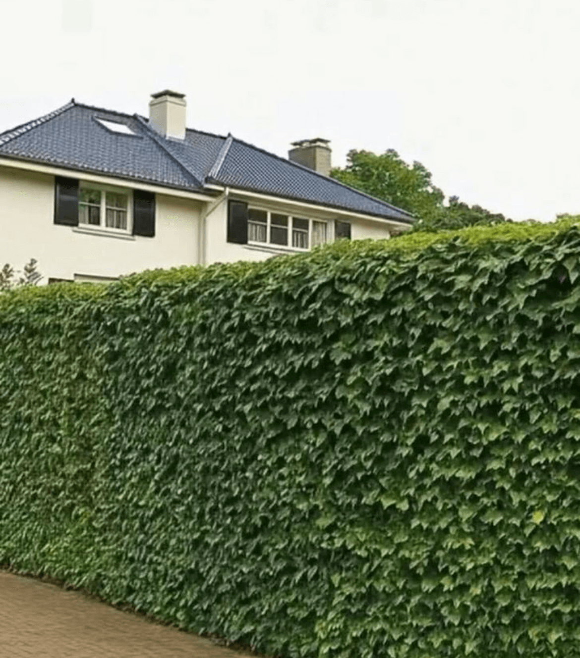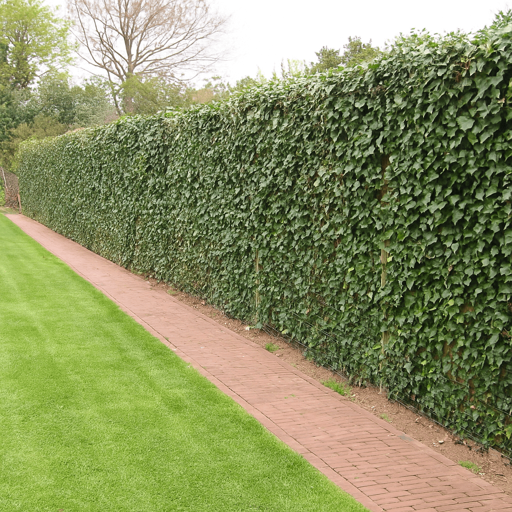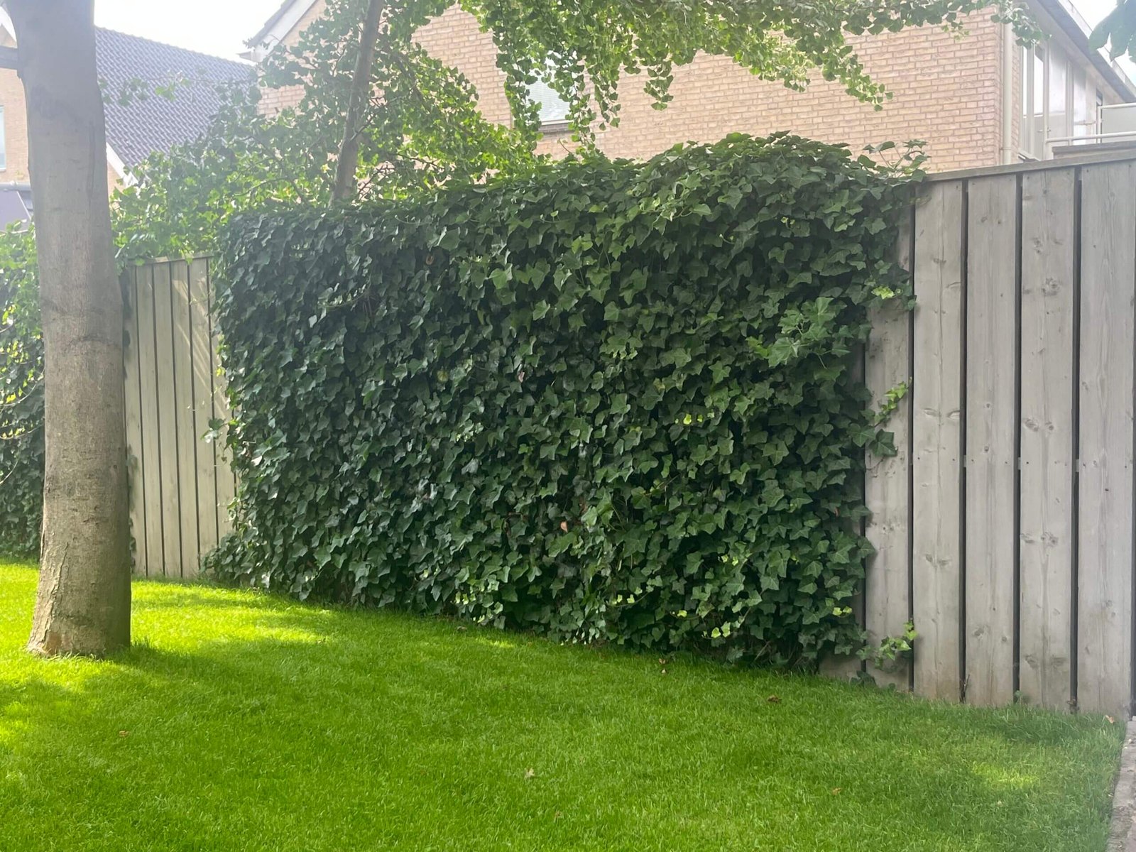 Hedera groeit mooi dicht zonder veel onderhoud. Met één à twee snoeibeurten per jaar blijft de haag strak en gezond.